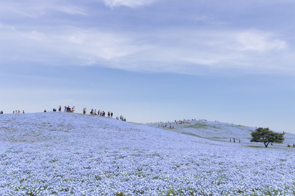 四季折々の花と多彩なアクティビティを楽しめる国営ひたち海浜公園。勝田駅東口2番乗り場から路線バスに乗車し、海浜公園西口で下車です。入場したら、向かうは「みはらしの丘」!広大な丘一面に植えられたネモフィラが開花しており、見渡す限り青一色に染まる幻想的な光景を目にすることができます。可憐なネモフィラの花に囲まれてまるで空中散歩をしているような心地で丘を登れば…見上げれば青空、見下ろせば蒼海!。