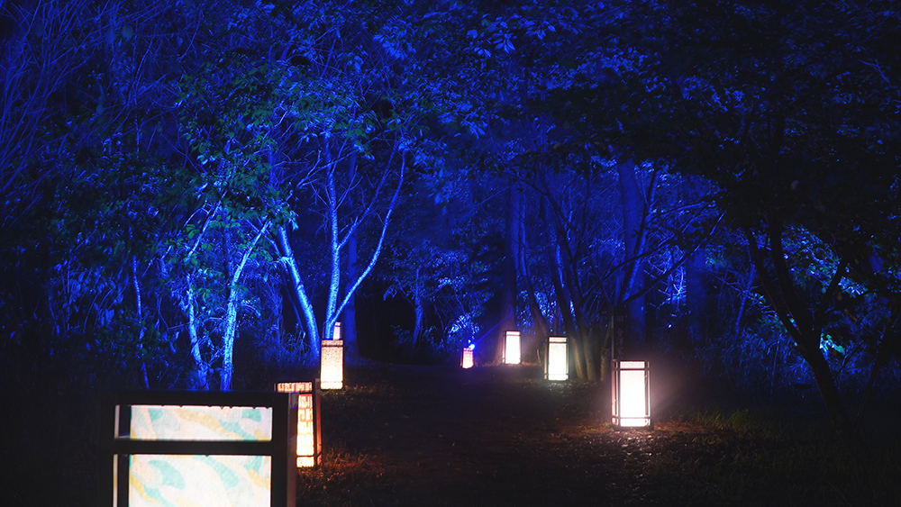 林をスクリーンに、カラーのレーザービームで文字やイラストを映し出すみはらしの丘のレーザー演出